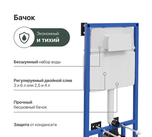 - Объем смывного бачка: 3 и 6 / 2.5 и 4 л.