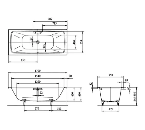 580 ммСтальная ванна Kaldewei Cayono Duo 724 170x75 272400010001 - двухместная, прямоугольная ванна с широким дном.