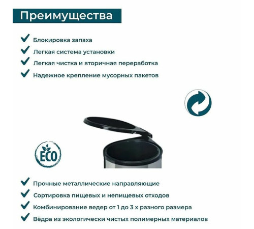 - Варианты крепления: крепление к фасаду и каркасу универсальное (левое/правое), корпус крепится к фасаду, крышка крепится к каркасу, ведро снимается.